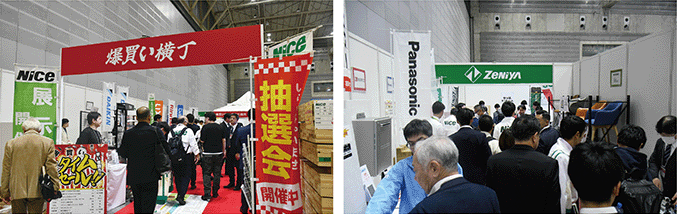 「爆買い横丁」では、メーカー様ご提供商品をはじめ、建材・住宅設備から日用品まで幅広いラインアップの商品を、展示会当日限定の価格で販売を行う「超大特価祭」が行われました。「ZENIYA®」コーナーでは初めてキャッシュレス決済を導入し、基礎資材や副資材に加え、高性能シャワーヘッドや高圧洗浄機、キャンプ用品など、様々な商品を多くの来場者が購入する姿が見られました。現品限りで販売を行った国産材仕様のバレルサウナを購入する来場者も見られるなど、ブース内は終始活気に溢れ、賑わいを見せました。