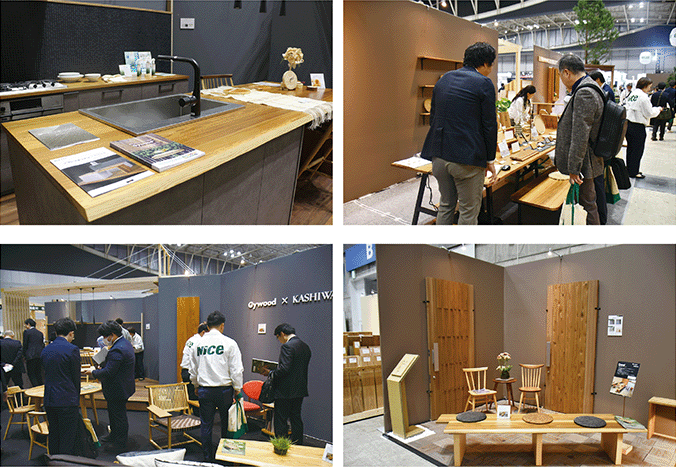 住居空間での活用シーンの展示では、柏木工㈱様をはじめとする家具・建具メーカー様とのコラボレーションによる家具や玄関・室内ドアに加え、ワークトップにGywood®の天板を施した当社グループオリジナルのキッチンなどに注目が集まりました。Gywood®が本来持つ形状安定性や耐久性、肌ざわりの良さを生かした商品が多く展示され、手に触れながら興味深く見学する来場者の姿が多く見られました。