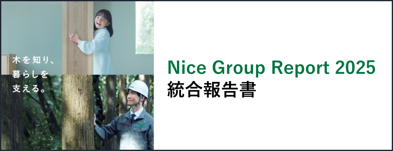 ナイスグループは、「私たちは 信頼を礎に 豊かな住まいと暮らしを実現します」という企業理念のもと、人と環境にやさしい自然素材「木」の普及、地震に強い住まいづくり、健康で快適な居住空間の提供を通じて、企業価値の向上と持続可能な社会の実現に挑戦し続けています。